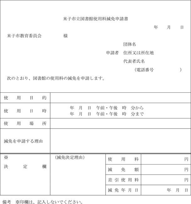 第14条 条例第12条の規定による使用料の減額又は免除を受けようとする者は、図書館使用料減免申請書(