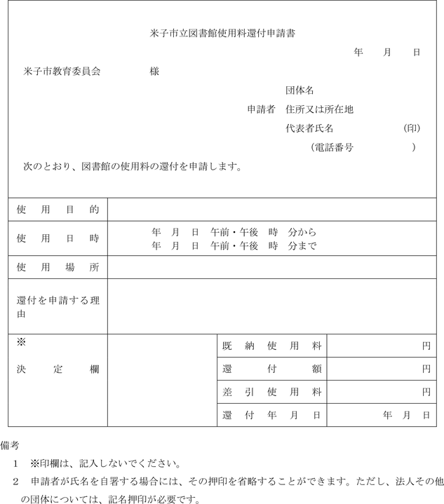 条例第13条ただし書の規定による使用料の還付を受けようとする者は、図書館使用料還付申請書(